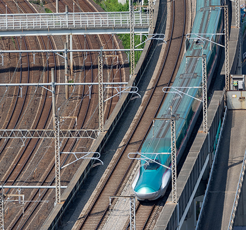 人々の移動や物流を支える鉄道インフラ。鉄道電気工事部門では、新幹線や地下鉄、モノレール、新交通システム等あらゆる鉄道における電気設備工事を行っています。手掛ける工事は5分野にわたり、電車に電気を供給する架線を張る電車線工事から、鉄道会社の電力ネットワーク基盤となる発変電工事、発電所から変電所に電気を送るための送電線工事や駅構内の照明設備等の電灯電力工事、鉄道の信号工事にまで至ります。