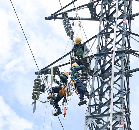 発電所と変電所あるいは変電所どうしを結んで、大量の電気を高電圧で効率よく送る役割を果たす送電線。鉄塔に電線を架設する架空送電設備と、地中の管路や洞道などに電力ケーブルを敷設する地中送電設備があり、安全と施工品質を第一に施工を行っています。