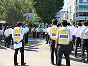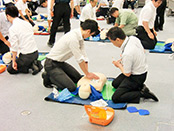 本店および各統括本部の合同訓練では、首都直下型地震を想定した避難訓練を実施し、広域避難場所への社員の避難誘導や避難場所での点呼等を行ったほか、午後からは上野消防署による救急処置訓練を実施し、AEDの使用方法、心肺蘇生および止血方法等、社員30名が受講しました。