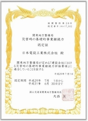 「建設会社における災害時の基礎的事業継続力」の認定取得 当社は、2017年7月1日付で国土交通省関東地方整備局より「建設会社における災害時の基礎的事業継続力」の認定を取得しました。