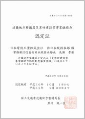 近畿地方整備局から「災害時建設業事業継続力」認定を取得 2018年9月26日付で、当社の西日本統括本部が、国土交通省近畿地方整備局「災害時建設業事業継続力」の認定を取得しました。