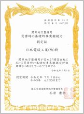 関東地方整備局「建設会社における災害時の基礎的事業継続力」の認定を更新 2019年7月1日付で、当社の事業継続計画である「日本電設事業継続計画(NDK BCP)」は、国土交通省関東地方整備局により「災害時の基礎的事業継続力」の認定が更新されました。