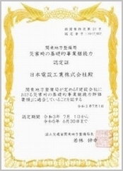 関東地方整備局「災害時建設業事業継続力」の認定を更新 2021年7月1日付で、当社の事業継続計画である「日本電設事業継続計画(NDK BCP)」は、国土交通省関東地方整備局により「災害時建設業事業継続力」の認定が更新されました。