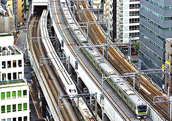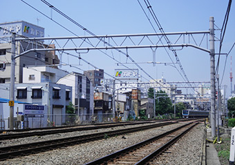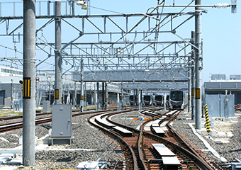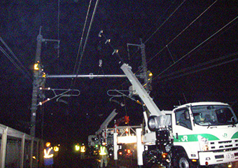 電車線とは、変電所からの電気をパンタグラフを介し、電車に供給する設備。パンタグラフに接触するトロリ線や、それを支える支持物、発電所からの電気を供給するき電線などの設計・施工を行っています。また、電車線路設備などの構造をシンプルに簡素・統合化したインテグレート化工事や耐震補強工事などでは、最新の軌陸車を使用し、効率的で安全な施工を行っています。