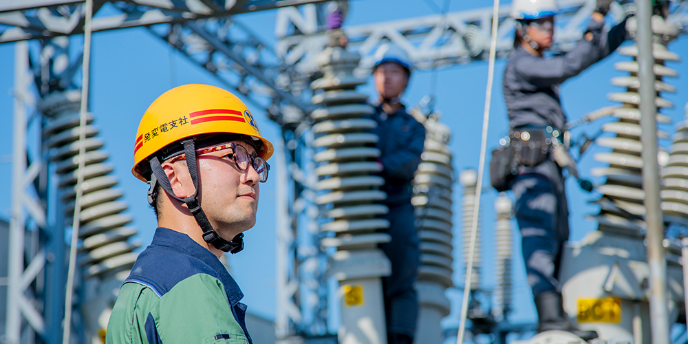 発電所と変電所あるいは変電所どうしを結んで、大量の電気を高電圧で効率よく送る役割を果たす送電線。鉄塔に電線を架設する架空送電設備と、地中の管路や洞道などに電力ケーブルを敷設する地中送電設備があり、安全と施工品質を第一に施工を行っています。