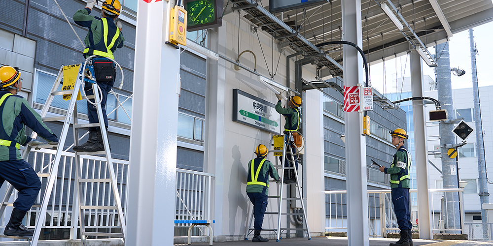 鉄道の安定輸送に欠かせない信号設備や線路沿線設備への電源供給、降雪による分岐器不転換を防止する電気融雪器の設置、駅舎内の照明・コンセント設備や電気掲示等お客様サービスのための設備に関する設計・施工を行っています。