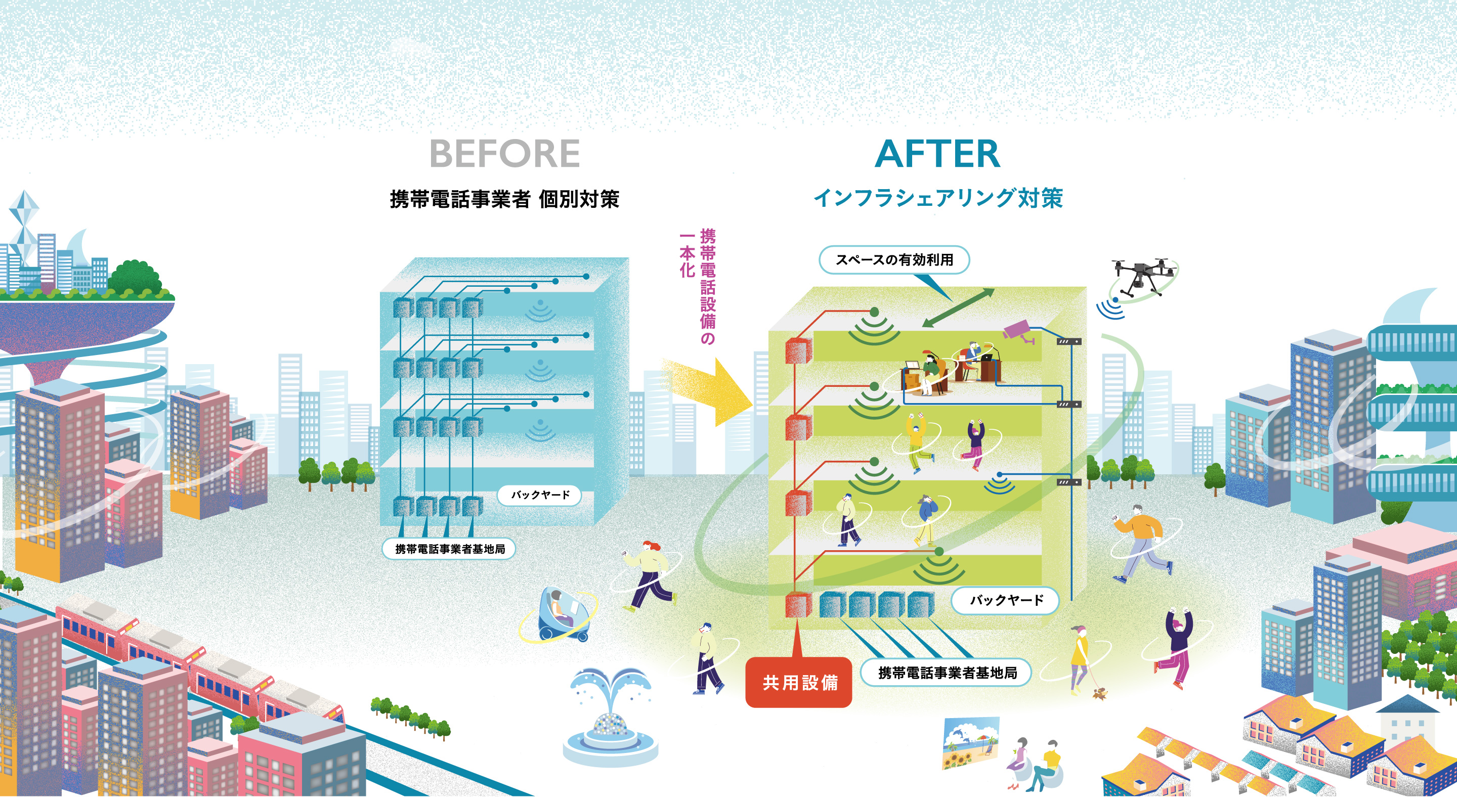 インフラシェアリングは、1本の通信アンテナを複数の携帯電話事業者で賢く共有することで、無駄なコストや環境への影響を抑えながら、5Gなどの最先端の通信サービスを都市部だけでなく日本全国へスピーディーに届け、私たちの暮らしや社会全体のデジタル化を支えるための重要な仕組みです。