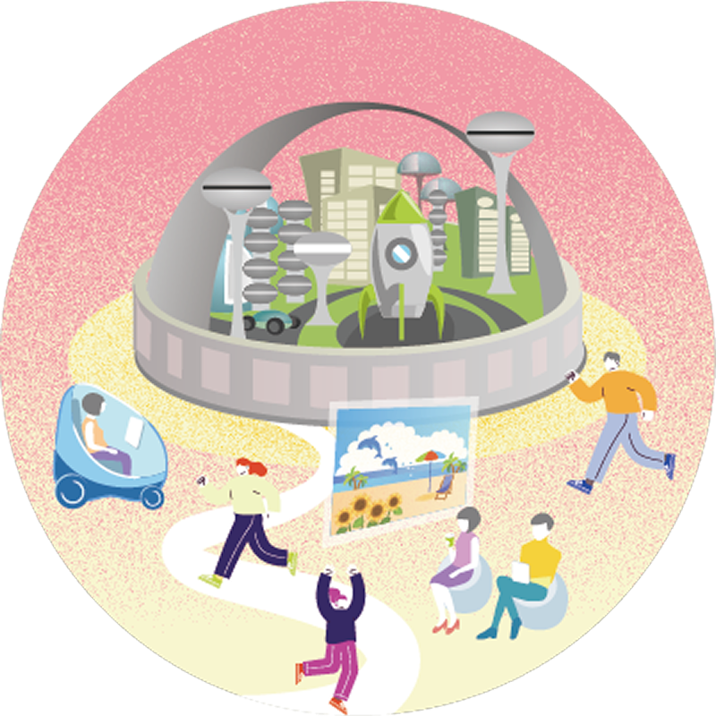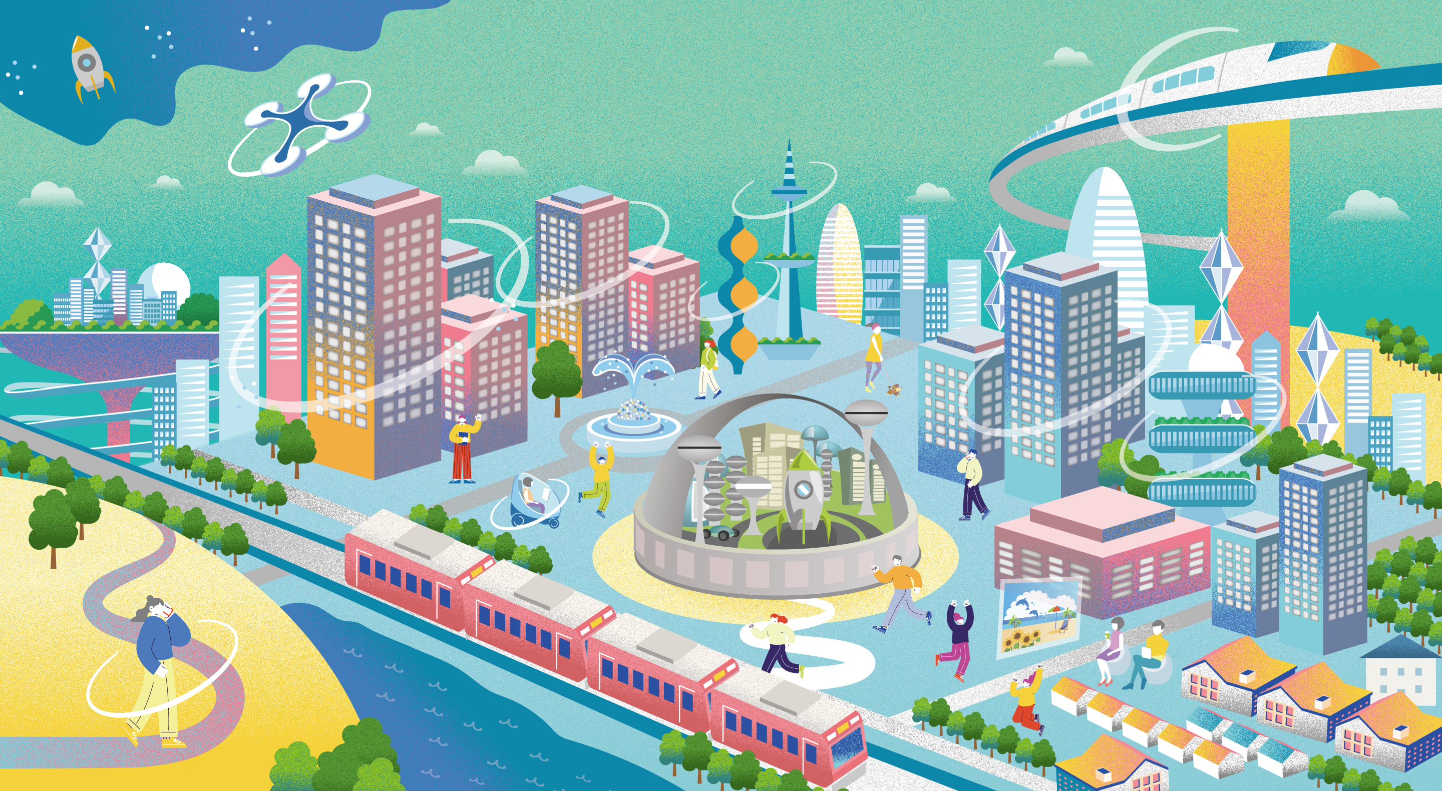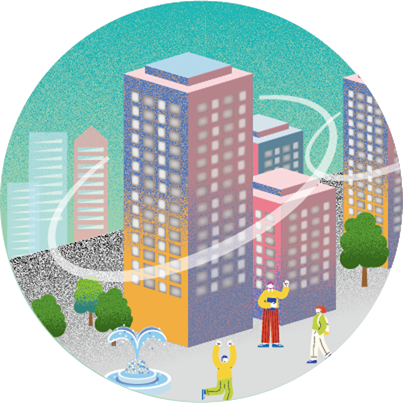 このビジュアルが表現しているのは、NDKが描く未来のまちの姿です。 駅を起点に通信の“脈”が街全体にめぐり、建物、空間、人々の暮らしが確かなつながりで支えられています。