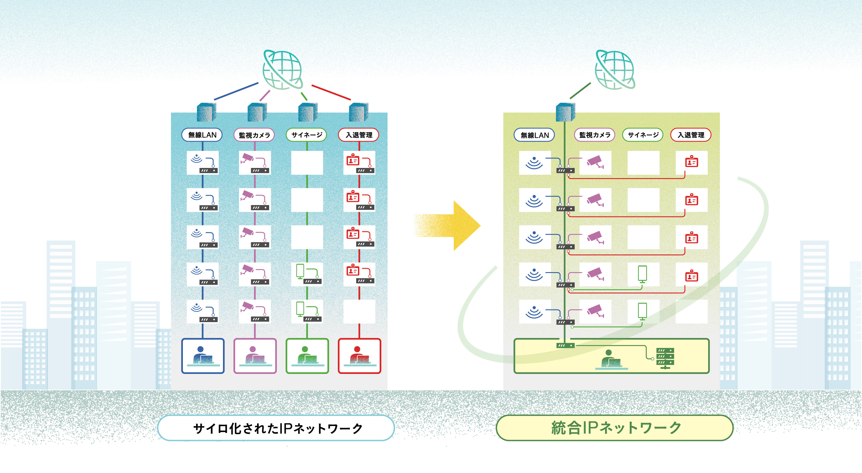 サイロ化されたネットワークから統合IPネットワークにすることで、配線、機器を集約することができスペースが有効活用できる。また点検保守する機器を減らすことができ長期的な設備投資金額を抑えることができる。