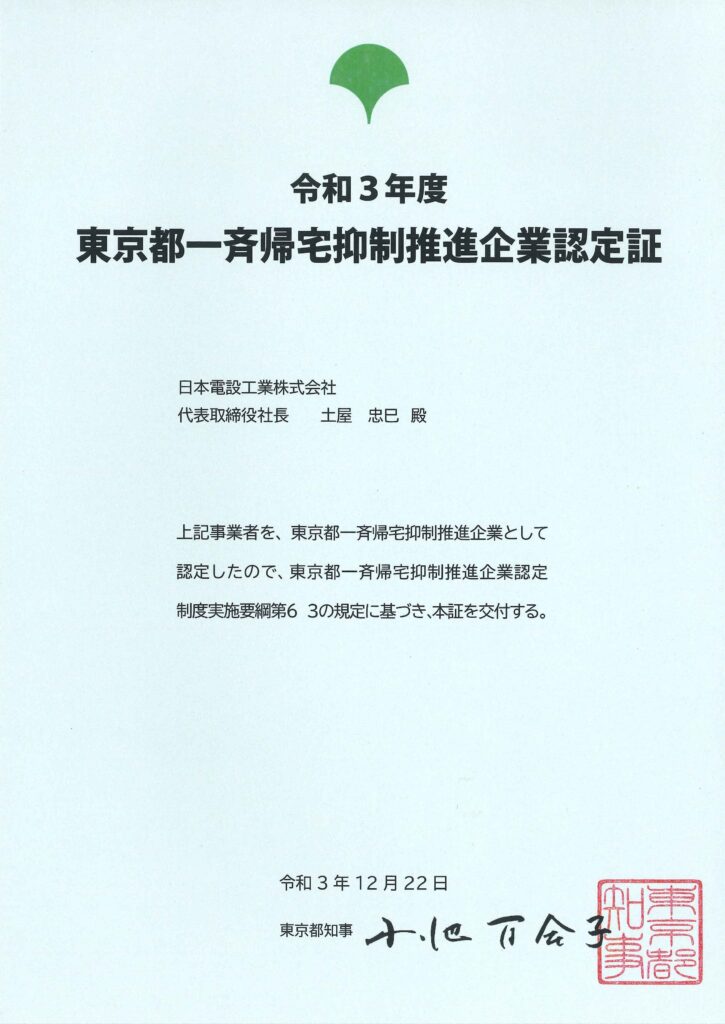 当社は、このたび東京都より、「東京都一斉帰宅抑制推進企業」に認定されました。