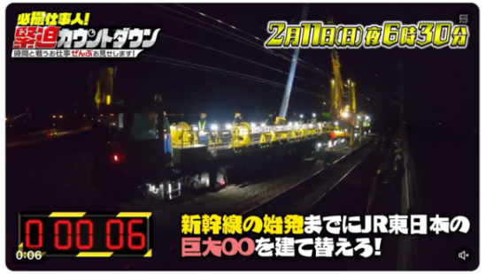 このたび、テレビ東京で放送される番組「必撮仕事人!緊迫カウントダウン 時間と戦うお仕事ぜんぶお見せします!」にて、当社が施工を担当している東北新幹線電柱建替工事の様子が放送されることになりました。