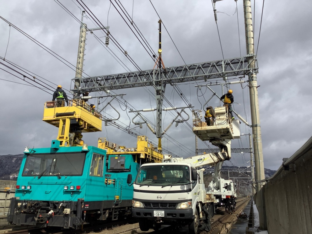復旧作業は、余震や天候不良による工程ずれ込みの懸念もあり厳しい環境となりましたが、被災箇所の電柱建植や電車線修繕を行い、2月22日の仙台-一ノ関間での営業運転再開、2月24日の全線での営業運転再開に貢献しました。