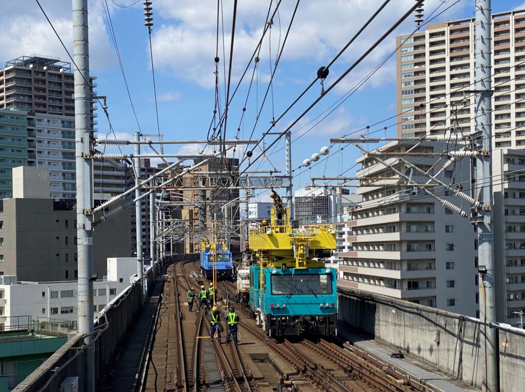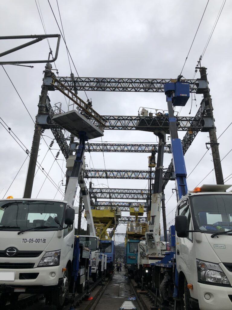 復旧作業は、余震や天候不良による工程ずれ込みの懸念もあり厳しい環境となりましたが、被災箇所の電柱建植や電車線修繕を行い、4月4日の仙台・一ノ関間での営業運転再開および4月14日の全線で