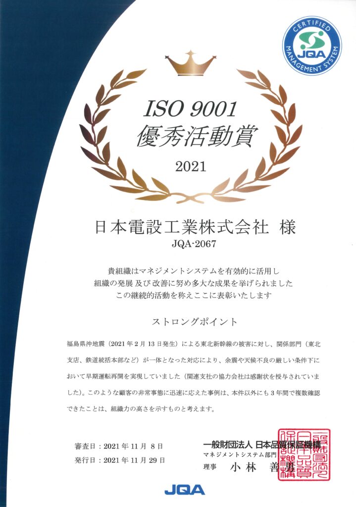 更新審査では、福島県沖地震(2021年2月13日発生)による東北新幹線の被害に対する早期運転再開の実現など、顧客の非常事態に迅速に応えた事例が当社の組織力の高さを示すものと評価していただきました。