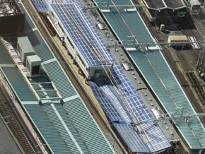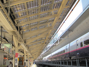 2011年2月25日(金)、東京駅東海道線ホーム(9・10番線)屋上に設置された太陽光発電システムの使用が開始され、当社は太陽光パネルの設置に伴う配線工事を担当しました。
